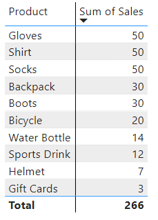 To illustrate this issue, see the example below. More data has been added and now we have several products which have the same number of total sales, with 266 sales across all products. When a Pareto line is calculated using the measure above, the line is flat across the products which have the same value. Since all products with 50 sales are kept when filtering products based on total sales, the sum of their sales (150) is used for each of them. This leads to a value of 56.39% (150/266) for each product, rather than the cumulative 18.80% (50/266) at each step that is expected. We see the same issue again for the two products with 30 sales each.